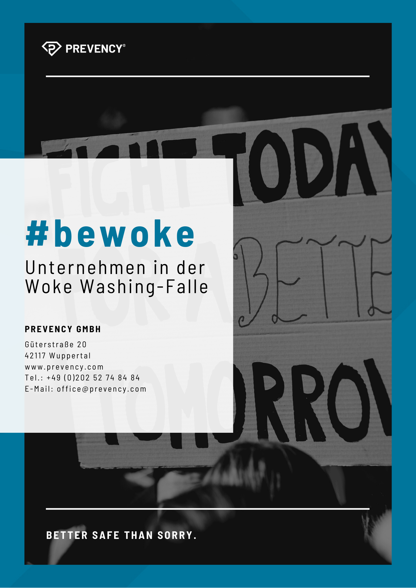 Woke Washing ist ein realer Risikofaktor für Unternehmen, der mit dem steigenden Druck, Haltung zu beziehen, an Relevanz gewinnt. Doch wie umgehen mit Purpose und Woke Washing? Keine Position beziehen ist mittlerweile keine wirkliche Option mehr. Daher ist es essentiell, Methoden und Wege zu finden, um dem Risiko des Woke Washings adäquat zu begegnen und dieses bestenfalls dauerhaft zu minimieren. Wir von PREVENCY® haben dazu verschiedene Empfehlungen für das Risikomanagement erarbeitet. Diese finden Sie in unserem Whitepaper „#bewoke“.